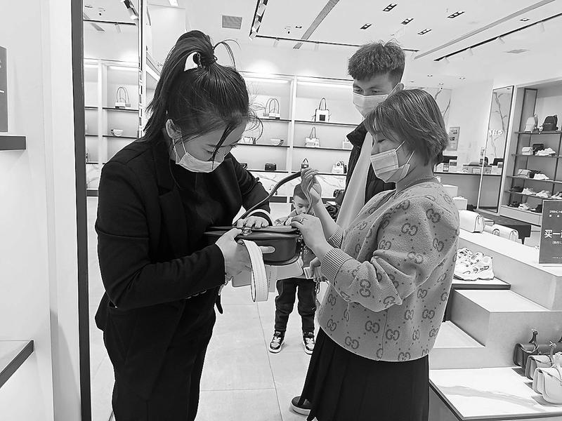 3月1日,在吴忠万达广场某包店,导购员正在向顾客推介包包。 本报讯(记者 冯荣)连日来,借助即将到来的“三八”妇女节,吴忠市各大实体店和电商平台摩拳擦掌,提前促销、打折、换季、清仓……打“女人牌”,挖掘“她”商机,以“她消费”为主题的促销手段齐上阵,提前引爆“她消费”。