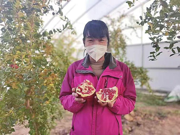 10月31日,青铜峡市小坝镇林皋村村民包月侠展示掰开的石榴,一颗颗色泽鲜艳的石榴籽如红宝石一般。 本报记者马一萍