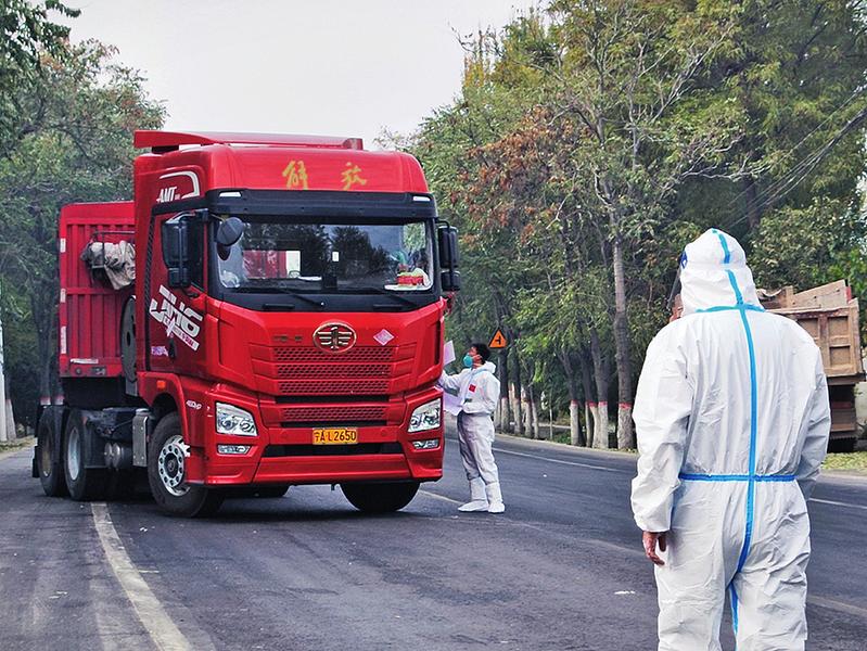 10月26日,在青铜峡火车站至申能吴忠热电厂路段,工作人员穿着防护服对煤炭运输车辆驾驶员进行扫码、测温,严格落实疫情防控要求。