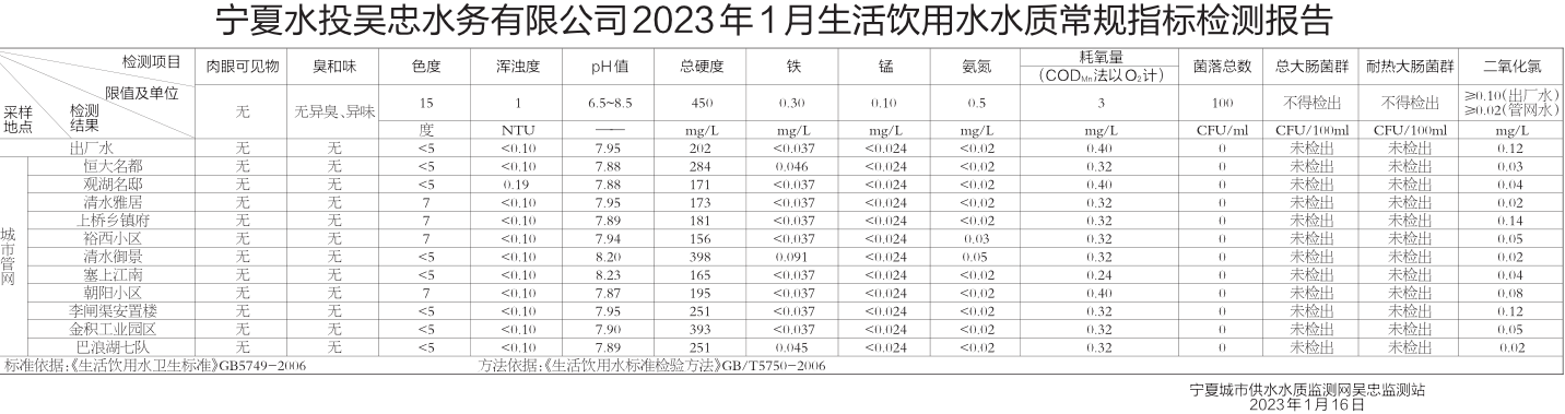 宁夏水投吴忠水务有限公司2023年1月生活饮用水水质常规指标检测报告
