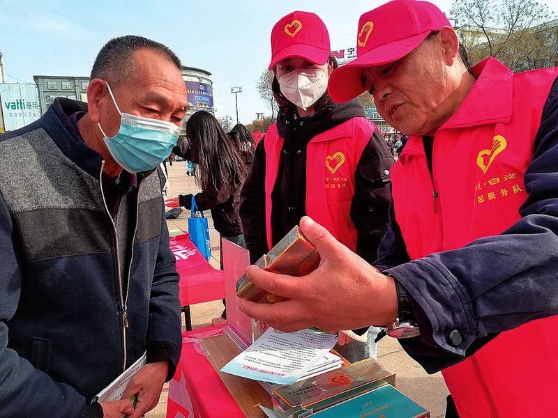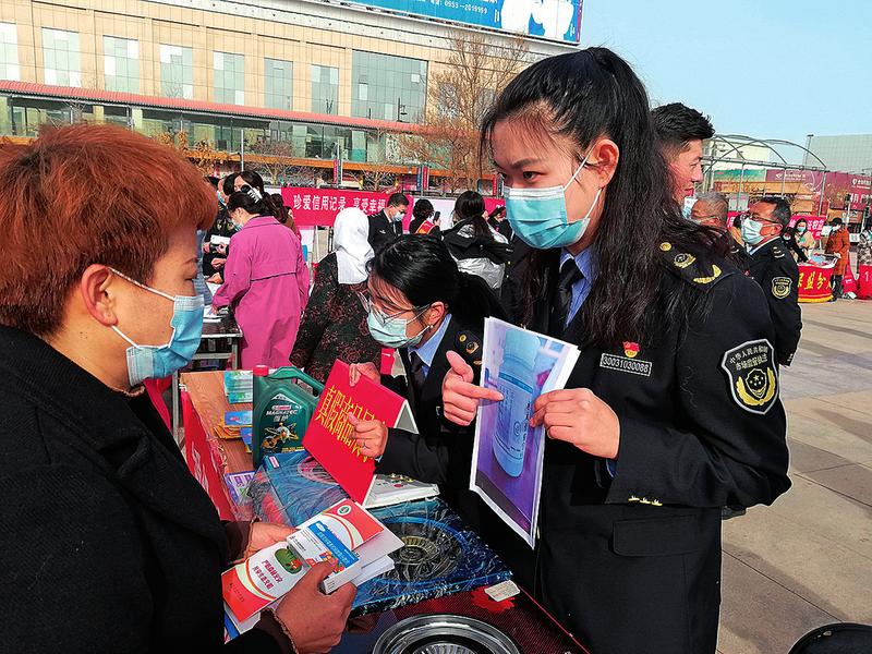 3月15日,吴忠市市场监管局执法人员在吴忠开源广场向群众讲解购买药品时需要注意的事项。