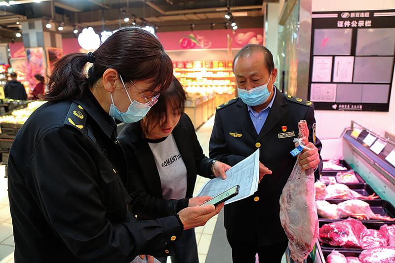 3月15日,青铜峡市市场监管局执法人员在辖区一超市里检查各类肉质产品。