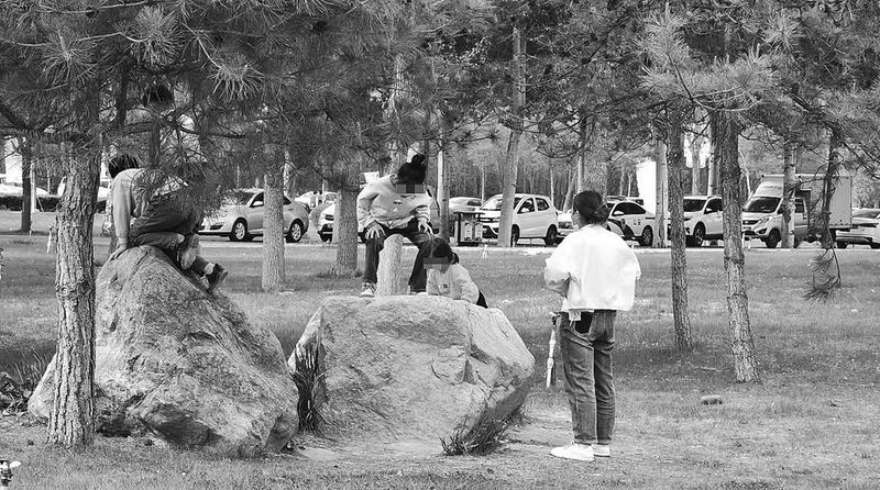 5月2日,在吴忠市文化馆附近的草坪,某位市民无视公共绿地的警示牌,带着小孩在景观石上嬉戏玩闹。 本报记者清风
