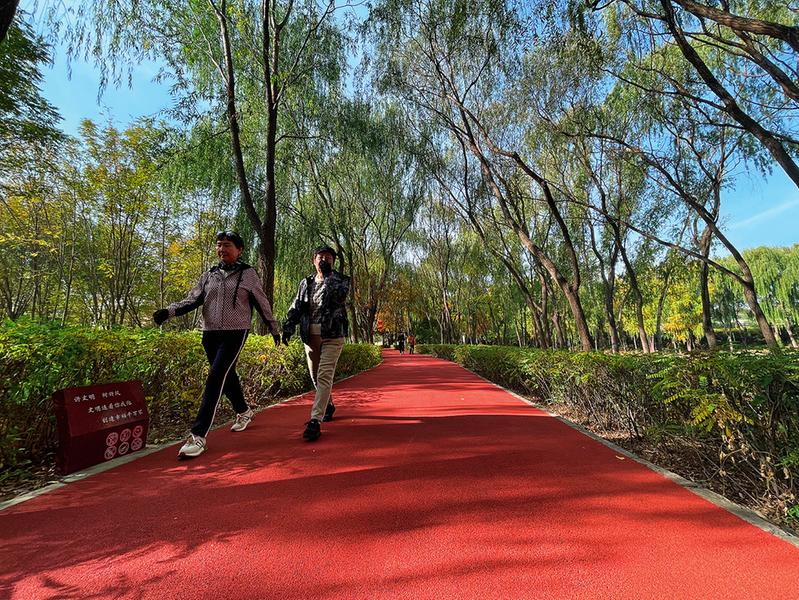 步道上跑步健身。这样的城市美景,得益于我市深入打赢蓝天保卫战的各项举措。