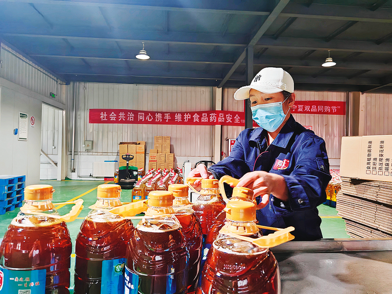 近日,在宁夏同心工业园区的宁夏五谷丰生物科技发展有限公司生产车间里,务工人员有序开展胡麻油装箱作业。 本报记者 丁宝萍