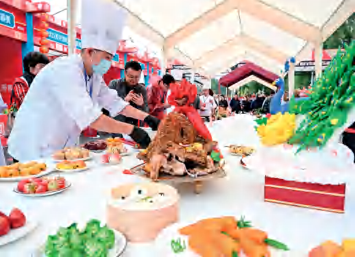 10月1日,在吴忠市利通区牛家坊民俗文化村举行的第五届吴忠早茶美食文化节厨艺争霸赛上,厨师为游客展示特色美食。 新华社发 本报记者 张娜 王思远