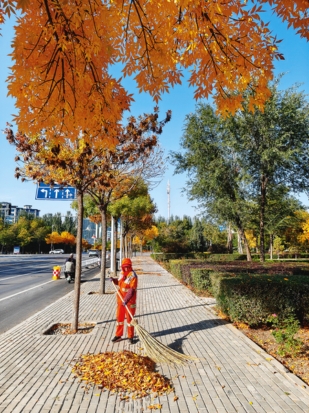 吴忠市利通区的行道树渐渐泛黄,环卫工人及时清扫落叶(摄于10月15日)。