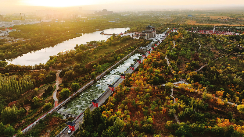 在盐池县盐州古城历史文化旅游区,树木黄绿相间、错落分布,水域波光潋滟,景色美不胜收(摄于10月19日)。 本报记者马慧见习记者李金汰