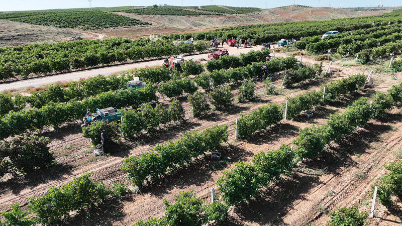 在吴忠市红寺堡区红寺堡镇弘德村连绵的葡萄园,村民采收酿酒葡萄(摄于10月17日)。
