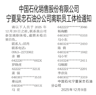 中国石化销售股份有限公司宁夏吴忠石油分公司离职员工体检通知