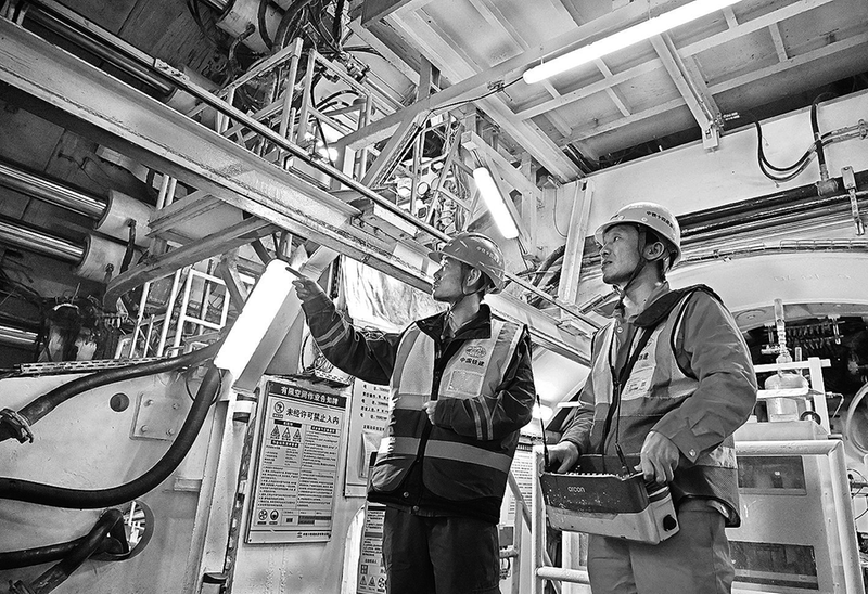 12月15日,中铁十四局建设者在海平面下91米进行施工作业。 12月15日,青岛胶州湾第二隧道南线主线隧道盾构段成功穿越多条海底破碎带,掘进突破3000米,按时完成预定施工目标。青岛胶州湾第二隧道连接青岛主城区和国家级新区青岛西海岸新区,设计时速80公里。工程全长17.48公里,其中主线隧道长14.37公里,包括长达9.95公里的海域段。 新华社发