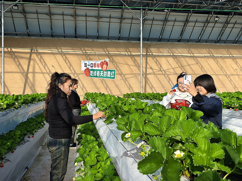 不同于传统的土培方式,这里的草莓采用高架立体无土栽培技术。“草莓‘吃’的是营养土,‘喝’的是净化水,温度还要实时调节。”网格员孟芳边查看温度计边介绍,“这种高架设计充分利用了空间,原来一垄地只能种一排,现在一垄地能种四排,采摘时还不用蹲下来,果子不沾土,既省力又干净。”