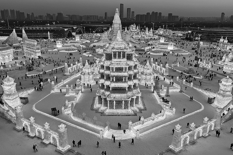 这是12月17日拍摄的哈尔滨冰雪大世界园区内的冰建景观。 12月17日上午10时,第二十七届哈尔滨冰雪大世界正式开园迎客。园区占地面积达120万平方米,总用冰用雪量突破40万立方米,以历届之最的规模,打造一座冰天雪地的“童话世界”。 新华社发