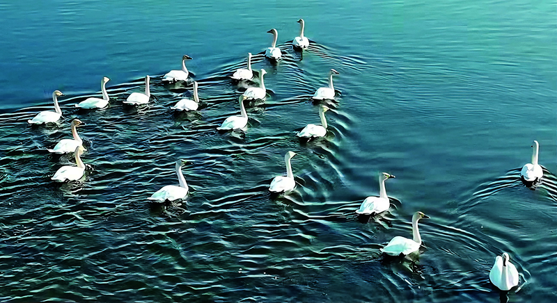成群的小天鹅在湿地水域。