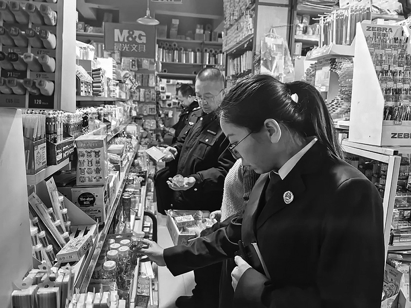 近日,同心县人民检察院检察官和该县市场监督管理局执法人员在某文具店检查。 本报讯(通讯员 马英花)近日,同心县人民检察院“同检同行”志愿先锋队与该县市场监督管理局双线联动,直击学校周边便利店、小卖部、文具店等重点场所,共同开展校园周边商标“假水”专项检查行动,以“双蓝”护航青少年合法权益。