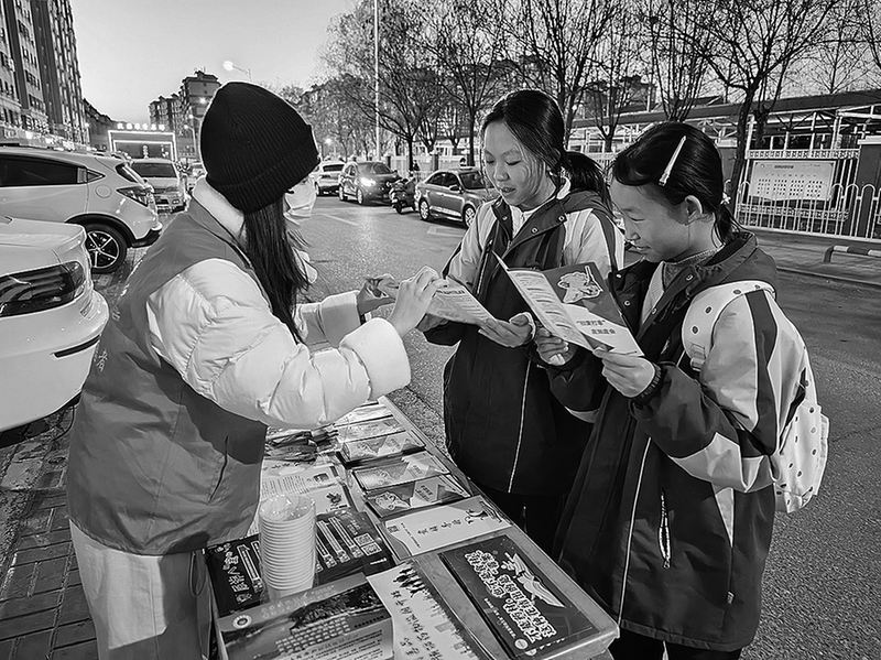 12月22日,吴忠市利通区板桥乡乃光湖社区志愿者向学生发放宣传资料。连日来,为净化校园周边文化环境,该社区开展“扫黄打非”主题宣传活动,重点聚焦如何辨别非法出版物和网络有害信息、保护个人信息安全、倡导绿色阅读等内容,共同为青少年营造一个清朗的成长空间。 冯荣 摄