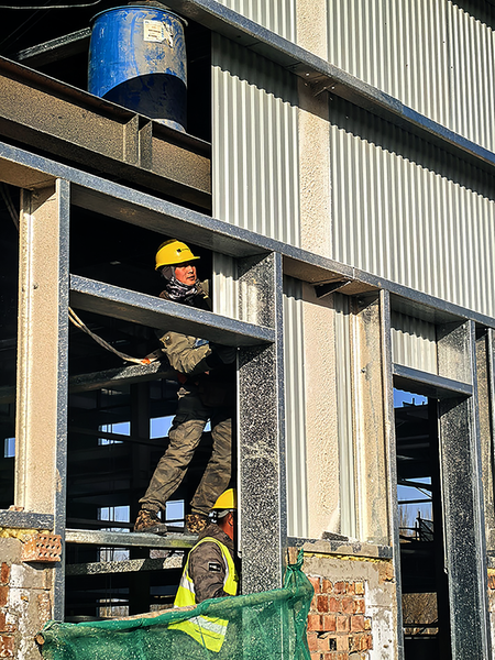 在吴忠市联农预制菜加工建设项目现场,工人对厂房钢结构外墙施工作业。该项目于今年8月初开工,预计明年建成投产,年果蔬初深加工量为2.5万吨、预制菜冷冻品产量为1.5万吨、集采集配农副产品量为1万吨(摄于12月16日)。