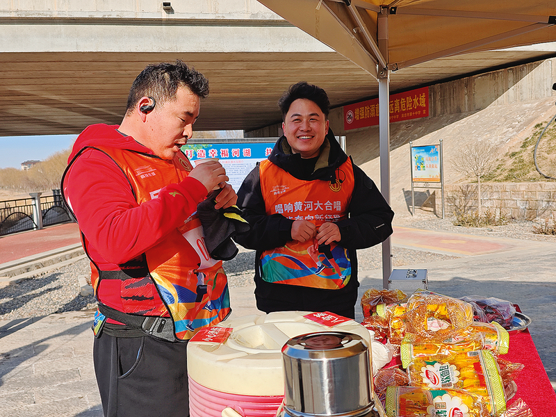 参赛选手在沿途补给点补水。 本报记者 吴海燕 马慧 王思远 见习记者 李金汰 锁冰心 董泊麟