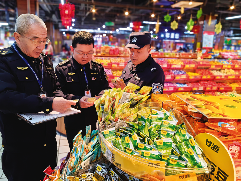 执法人员在吴忠市区一家商超进行检查(摄于2025年12月31日)。元旦前夕,我市市场监管部门协同市公安局环食药侦查队,聚焦燃气、食品、药品安全及市场保供稳价,深入燃气公司、餐饮门店、药店和商超等重点场所开展专项检查行动,全力筑牢节日期间安全防线,保障市民度过一个安全、祥和的节日。 张丽坤 冯荣 摄